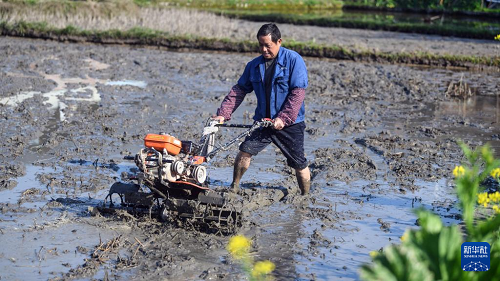 3月20日,广西三江侗族自治县良口乡农民在翻耕稻田。(新华社记者 张爱林 摄)