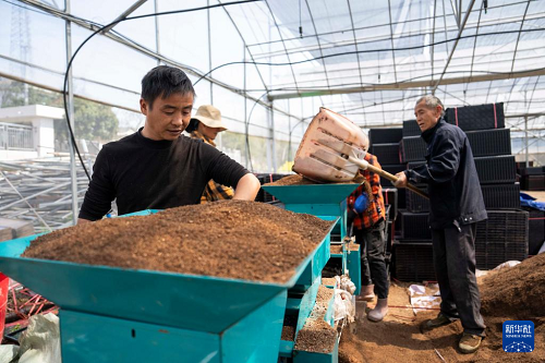 3月20日,在湖南省常德市汉寿县岩汪湖镇红菱湖村,农民在秧盘上铺撒育秧土壤。汉寿县是传统产粮大县,今年计划早稻播种58.8万亩,目前水稻育秧工作正在加紧进行。(新华社记者 陈思汗 摄)
