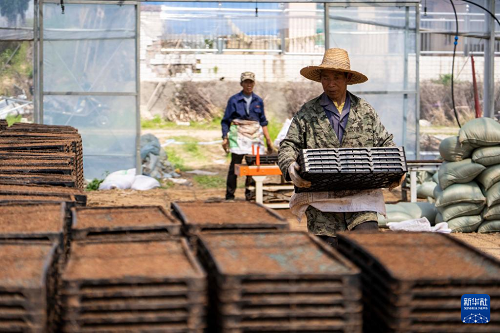 3月20日,在湖南省常德市汉寿县岩汪湖镇红菱湖村,农民在搬运配置好的水稻秧盘。汉寿县是传统产粮大县,今年计划早稻播种58.8万亩,目前水稻育秧工作正在加紧进行。(新华社记者 陈思汗 摄)