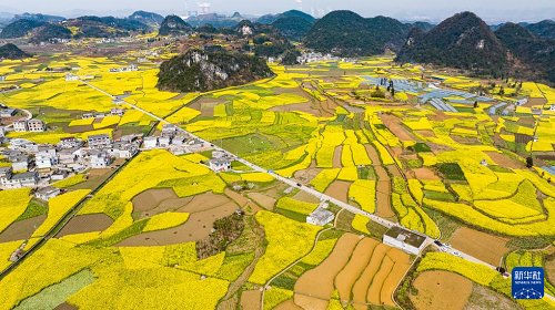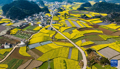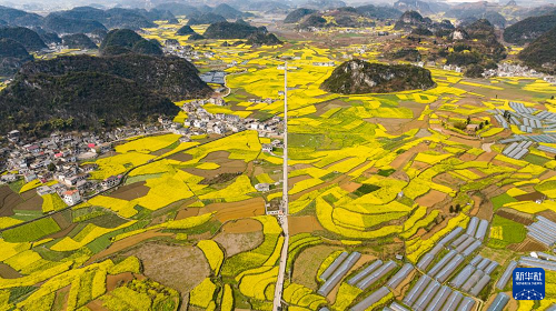 近日,贵州省六盘水市六枝特区木岗镇的15000余亩油菜花竞相绽放。金黄的油菜花同田地、道路、民居构成一幅幅美丽的春日画卷。