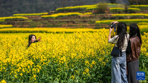 3月22日,游客在贵州省六盘水市六枝特区木岗镇瓦窑村的油菜花田里拍照游玩。(新华社记者 陶亮 摄)