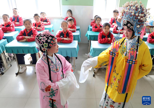 3月25日,在山东省滨州市博兴县第三小学,“京剧社团”的小学生给同学们表演京剧选段。(新华社发 陈彬 摄)