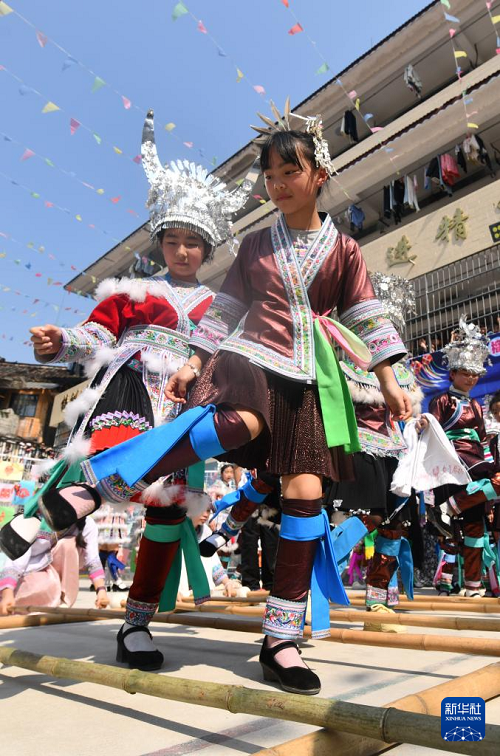 3月25日,柳州市融水苗族自治县杆洞乡中心小学学生在跳竹竿舞。(新华社记者 黄孝邦 摄)