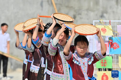 3月25日,柳州市融水苗族自治县杆洞乡中心小学学生在表演。(新华社记者 黄孝邦 摄)