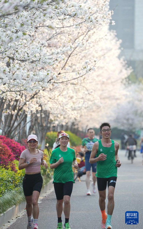 3月26日,人们在樱花跑道晨跑。(新华社记者 翁忻旸 摄)