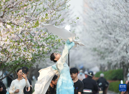 3月26日,一名着传统服饰的女子在樱花树间摆姿势拍摄短片。(新华社记者 翁忻旸 摄)