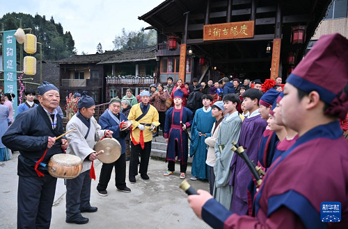 3月30日,人们身着传统服饰在宣恩县椒园镇庆阳古街前表演国家级非物质文化遗产“薅草锣鼓”。(新华社发 宋文 摄)