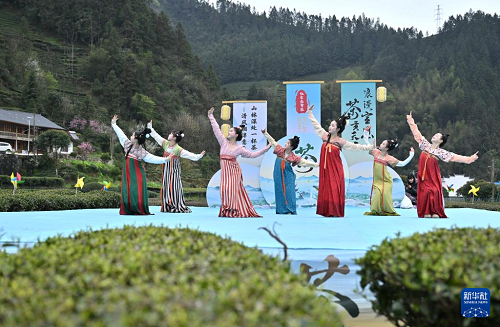 3月30日,身着传统服饰的姑娘在宣恩县椒园镇庆阳古街的茶园里翩翩起舞。(新华社发 宋文 摄)