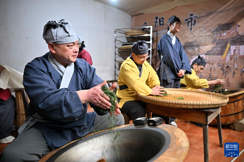 3月30日,村民在湖宣恩县椒园镇庆阳古街表演手工制茶。(新华社发 陈绪开 摄)