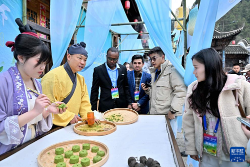 3月30日,游客在宣恩县椒园镇庆阳古街观看手工抹茶制作。(新华社发 陈绪开 摄)