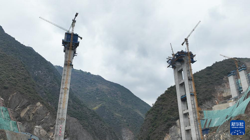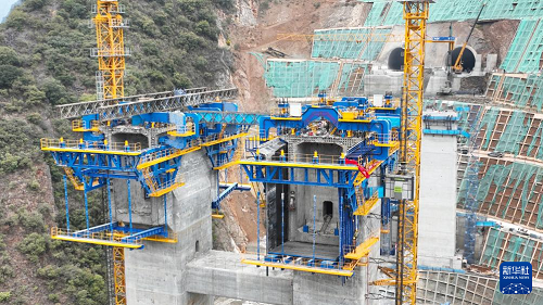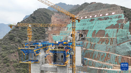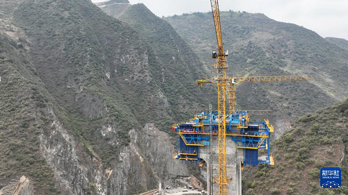 这是3月31日在渝昆高铁洛泽河特大桥悬臂浇筑施工现场拍摄的“虹鹰1号”智能悬臂筑桥机(无人机照片)。(新华社发 彭洪 摄)