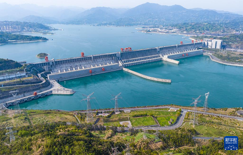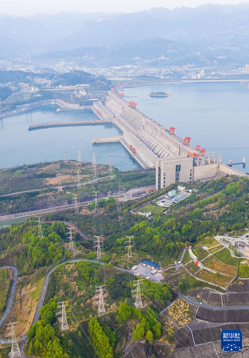 这是4月1日在湖北宜昌拍摄的三峡大坝及外送输电线路(无人机照片)。(新华社发 郑家裕 摄)