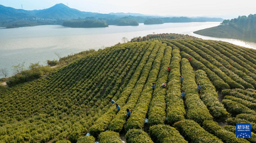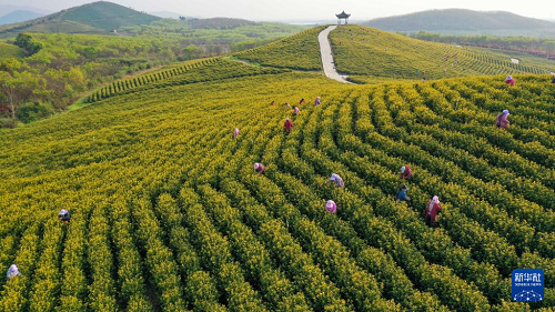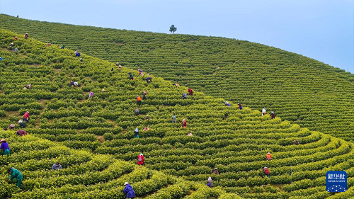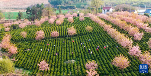 4月1日,在安徽省宣城市郎溪县姚村镇的一处茶园,茶农们在采摘茶叶(无人机照片)。(新华社发 李晓红 摄)