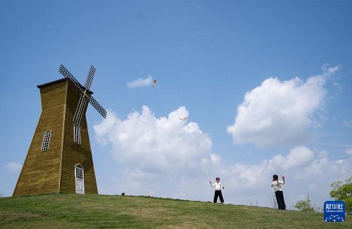 4月6日,在成都西湖公园,两个小朋友在草地上放风筝。(新华社记者 江宏景 摄)