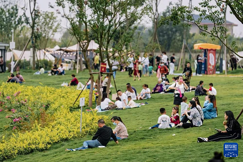 4月6日,在成都西湖公园,游客在草地上休闲。(新华社记者 江宏景 摄)