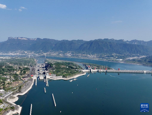 4月8日,在湖北省宜昌市,船舶有序通过三峡枢纽(无人机照片)。(新华社发 王罡 摄)