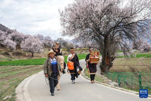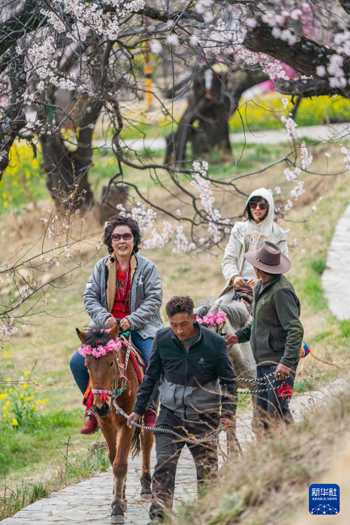 4月2日,游客在林芝市嘎拉村体验马背观花。(新华社记者 丁增尼达 摄)