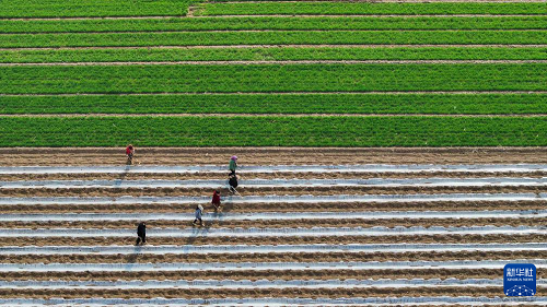 4月9日,河北省遵化市刘备寨乡农民在瓜田扣地膜(无人机照片)。(新华社发 刘满仓 摄)