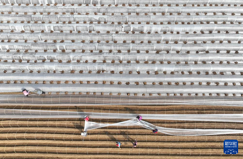 4月9日,河北省石家庄市栾城区西营乡段家庄村农民在姜田覆盖地膜(无人机照片)。(新华社发 梁子栋 摄)