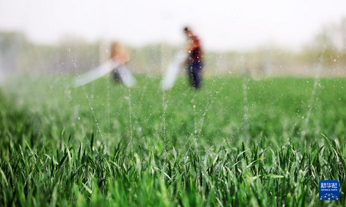 4月9日,山东省临沂市郯城县郯城街道农民在田间浇水。(新华社发 张春雷 摄)