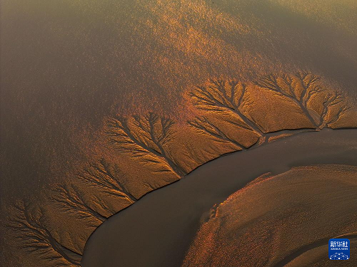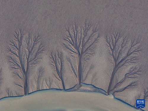 这是2024年10月29日在盐城市东台条子泥湿地拍摄的“潮汐树”(无人机照片)。(新华社记者 李博 摄)