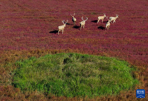 这是2024年10月29日在盐城市东台条子泥湿地拍摄的麋鹿(无人机照片)。(新华社记者 李博 摄)