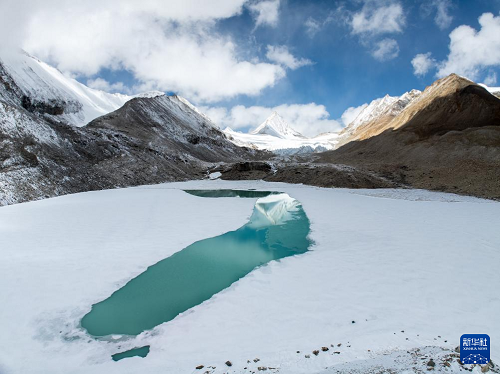 4月13日拍摄的普拉喜琼峰脚下的曲隆嘎木措冰川湖(无人机照片)。(新华社发 董志雄 摄)