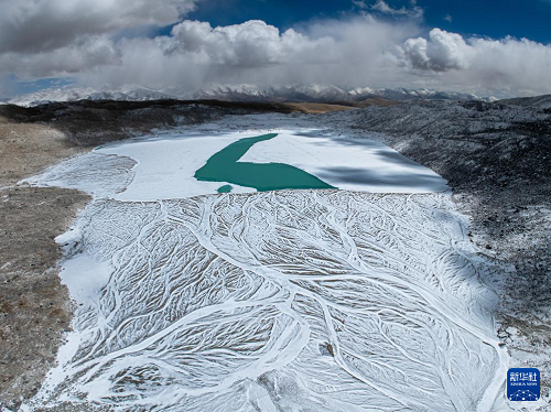 空中俯瞰普拉喜琼峰脚下的曲隆嘎木措冰川湖(4月13日摄,无人机照片)。(新华社发 董志雄 摄)