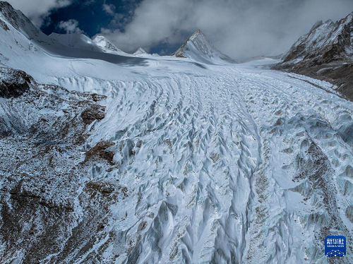 空中俯瞰普拉喜琼峰脚下的曲隆嘎木冰川(4月13日摄,无人机照片)。(新华社发 董志雄 摄)