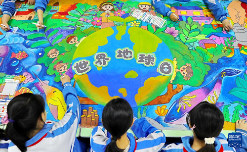 4月21日,河北省秦皇岛市海港区先盛里小学学生在手绘环保长卷。(新华社发 曹建雄 摄)
