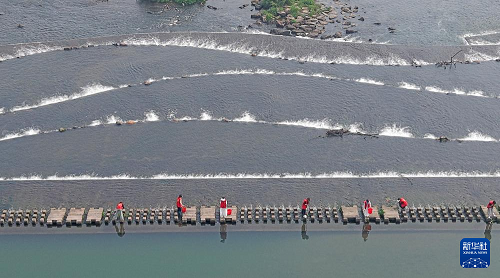 4月21日,浙江省台州市仙居县白塔镇第一幼儿园老师与河长在永安溪巡河护水(无人机照片)。(新华社发 王华斌 摄)