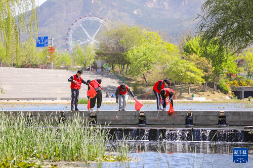 4月21日,河北省遵化市兴旺寨镇志愿者在当地一处景区捡拾杂物。(新华社发 刘满仓 摄)