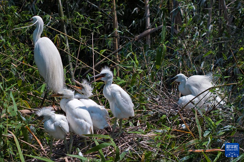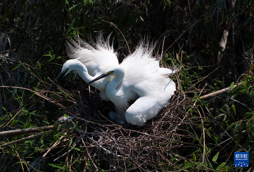 4月20日,在重庆市大足区珠溪镇,两只成年白鹭在抚养刚出生不久的幼崽。(新华社记者 陈诚 摄)