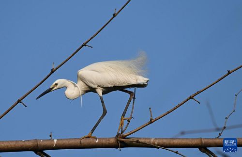 4月21日,在重庆市大足区珠溪镇,一只白鹭小心翼翼地走在竹枝上。(新华社记者 陈诚 摄)