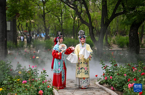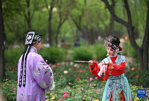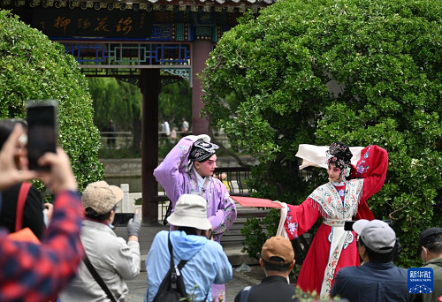 5月5日,演员在天津人民公园为观众表演京剧《西厢记》。(新华社记者 孙凡越 摄)