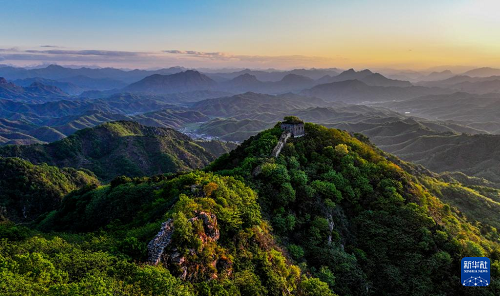 5月6日在河北省遵化市小厂乡拍摄的洪山口古长城晨景(无人机照片)。(新华社发 刘满仓 摄)