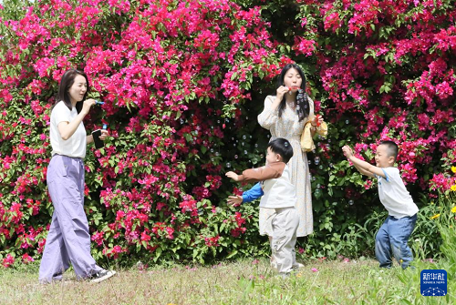 5月10日,在四川乐山三角梅花廊,家长带着孩子玩耍。(新华社发 李华时 摄)