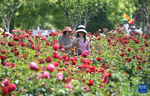5月11日,游客在山东省枣庄市一景区内赏花休闲。(新华社发 李志军 摄)