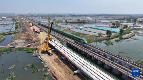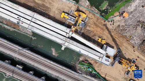 这是5月19日拍摄的沈山铁路鸭子河中桥新建大桥架梁工程施工现场(无人机照片)。(新华社记者 吴青昊 摄)