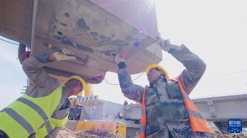 5月19日,工人在沈山铁路鸭子河中桥新建大桥架梁工程现场施工。(新华社发 徐鸣禹 摄)