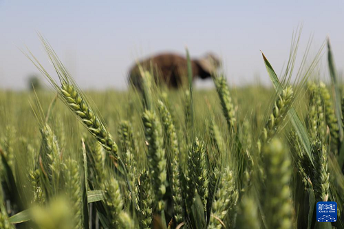 5月20日,在山东省滨州市沾化区冯家镇范庄村,农户在麦田里查看小麦长势。(新华社发 贾海宁 摄)
