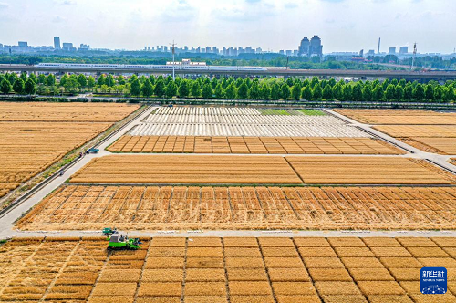 5月20日,在江苏里下河地区农科所(扬州市农科院)试验田,农民驾驶收割机收割小麦(无人机照片)。(新华社发 任飞 摄)
