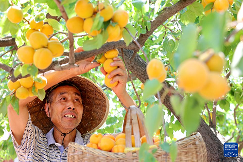 5月20日,山东省枣庄市市中区齐村镇凤凰岭村农民在果园采摘鲜杏。(新华社发 孙中喆 摄)