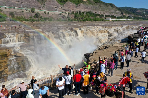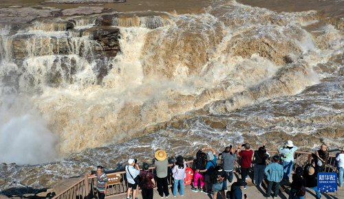 近日,受上游降雨影响,位于山西吉县和陕西宜川县交界的黄河壶口瀑布水量大增,壮美奔腾景象吸引众多游客前来游玩。