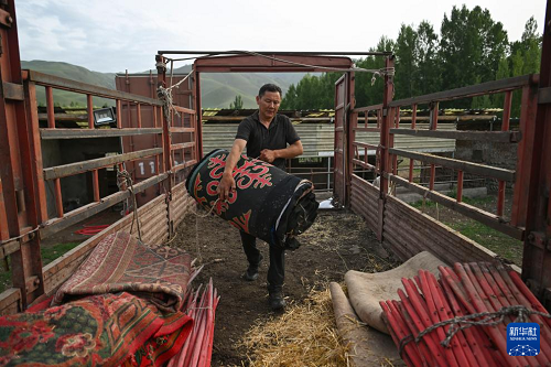转场第一天,在新源县那拉提镇塔依阿苏村,巴拉提江在家中小院内把毛毯搬上货车(6月10日摄)。(新华社记者 胡虎虎 摄)
