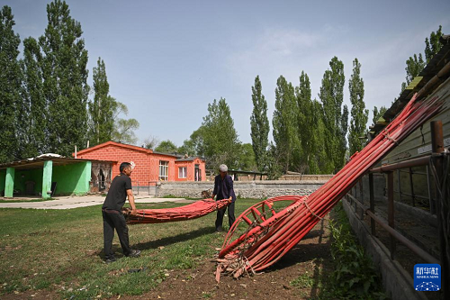 转场第一天,在新源县那拉提镇塔依阿苏村,巴拉提江(左)和邻居一起抬着毡房结构部件走在家中小院内(6月10日摄)。(新华社记者 胡虎虎 摄)