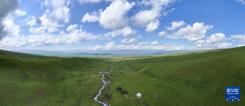 这是6月11日在新疆新源县那拉提草原拍摄的巴拉提江家的夏牧场和毡房(无人机照片)。(新华社记者 胡虎虎 摄)