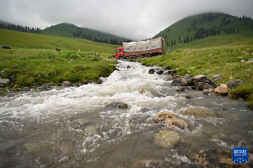 转场第二天,载着毡房等生活物资的货车驶过一处涉水路段(6月11日摄)。(新华社记者 胡虎虎 摄)