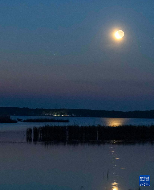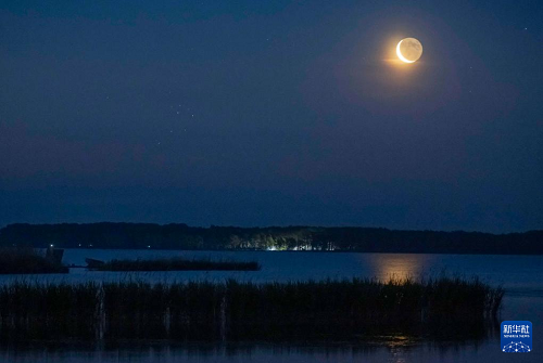 这是6月23日凌晨在黑龙江省齐齐哈尔市克钦湖拍摄的昴星团伴月。(新华社发 王勇刚 摄)