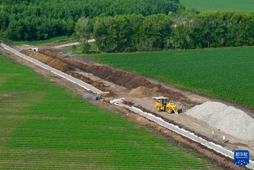 6月23日,北大荒集团北安分公司二龙山农场有限公司对排水沟进行护砌施工,构建柔性防护结构稳定边坡,减少水土流失,保护黑土地(无人机照片)。(新华社发 钱泊羽 摄)